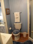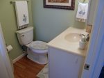 Bathroom 1: full: corner shower, toilet, sink; bathroom 2: toilet and sink;